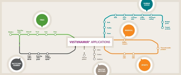 VESTENAMER® has been used as an additive in the rubber industry for years. By virtue of its properties, the versatile trans-polyoctenamer can solve a variety of problems in the compounding and processing of rubber. It can also improve the dynamic properties of the vulcanized material and as well be used to recycle waste rubber.